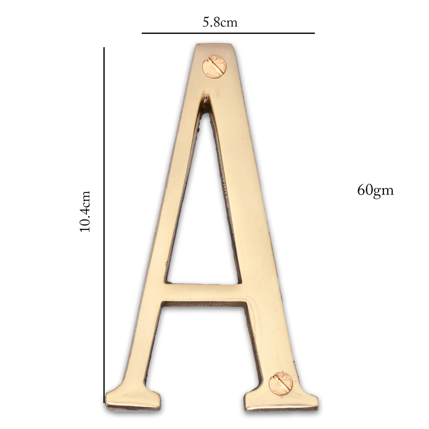 • Product Details: 1 Alphabet (A) | 2 Installation Screws | Height- 4 inches | Material: Brass.