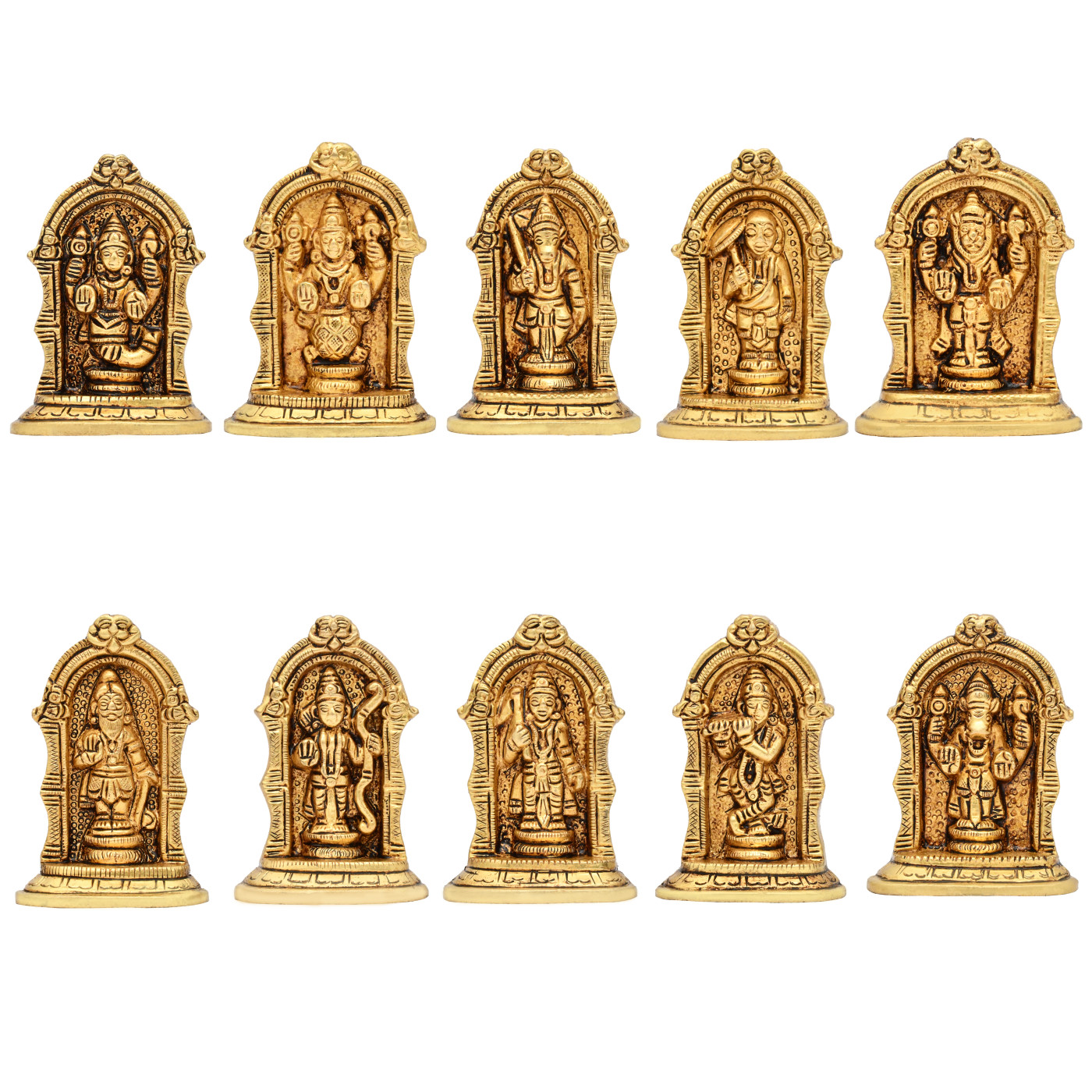 - Meticulously handcrafted brass sculpture depicting all ten avatars of Lord Vishnu/Narayan.