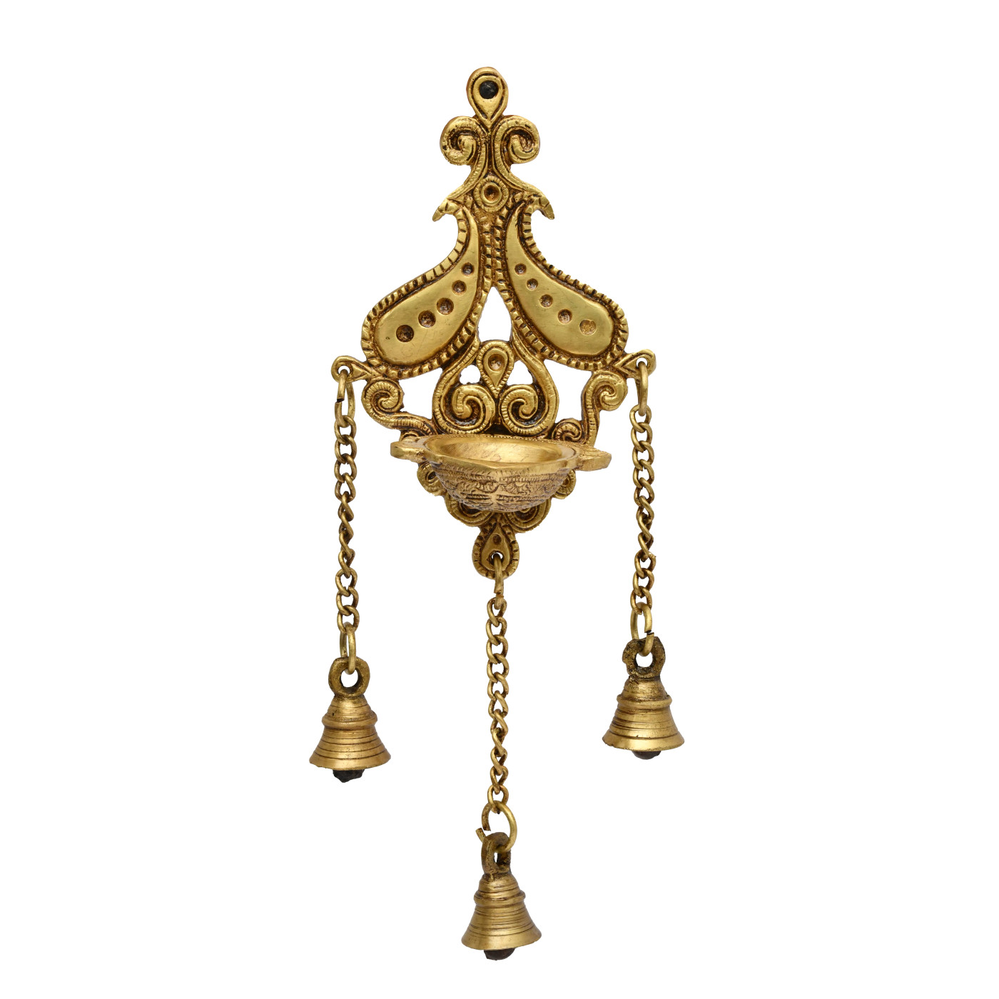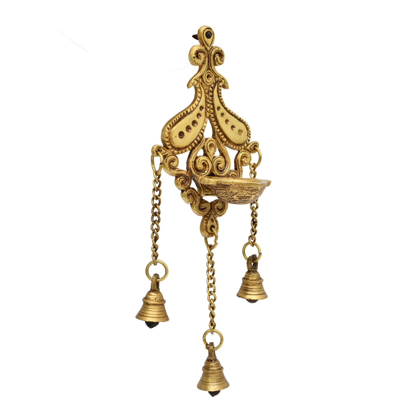 • Elegant Peacock Design: This beautifully handcrafted brass hanging diya features a detailed peacock design, making it an eye-catching and spiritual decoration for your Puja room, Mandir, or home décor
