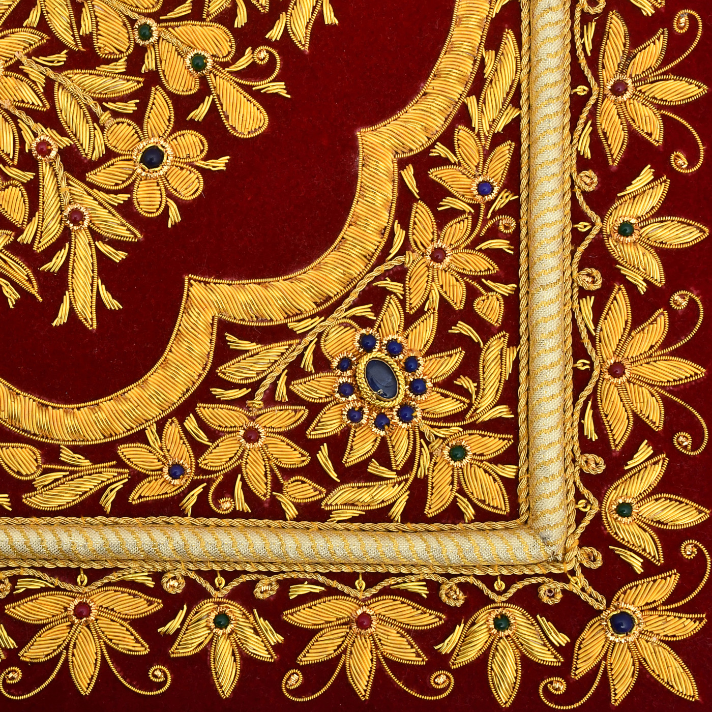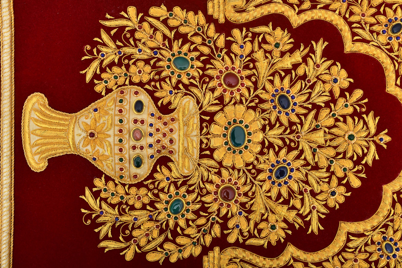 - An Absolutely Exquisite Wall Hanging studded with SEMI-PRECIOUS stones and intricate Zardozi Hand Embroidery in Gold metallic threads