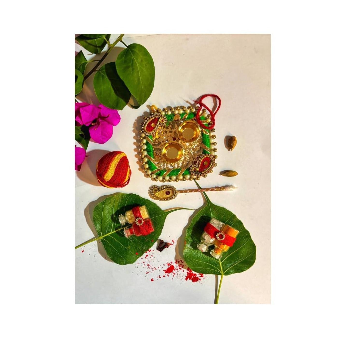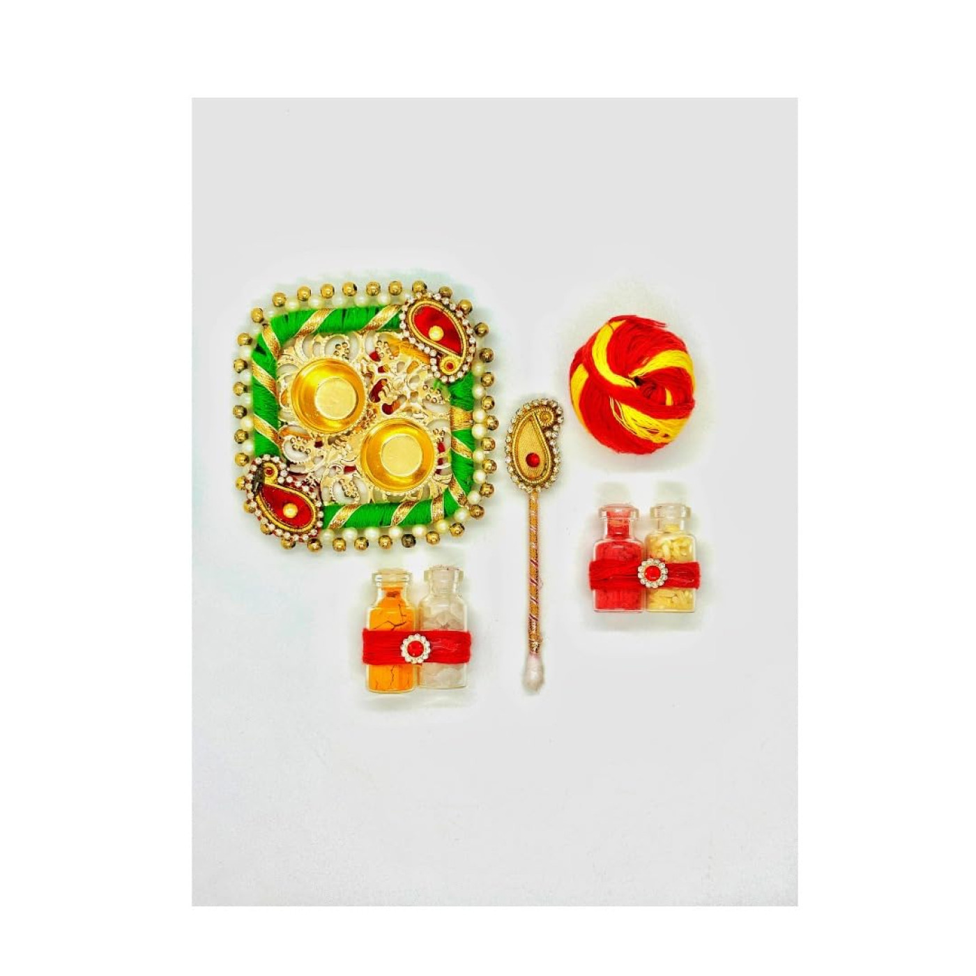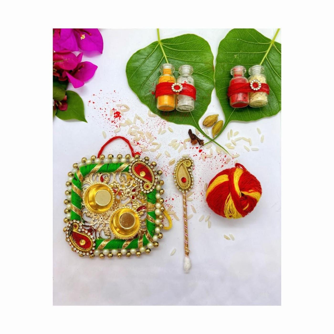 - High-Quality Ingredients: Includes premium puja samagri like 1 Plate,1 Tika Stick, 2Pooja Bowls, 1 Moli, 4 bottles of each rice, Turmeric, Crystalized Sugar, ensuring a pure and authentic worship experience.