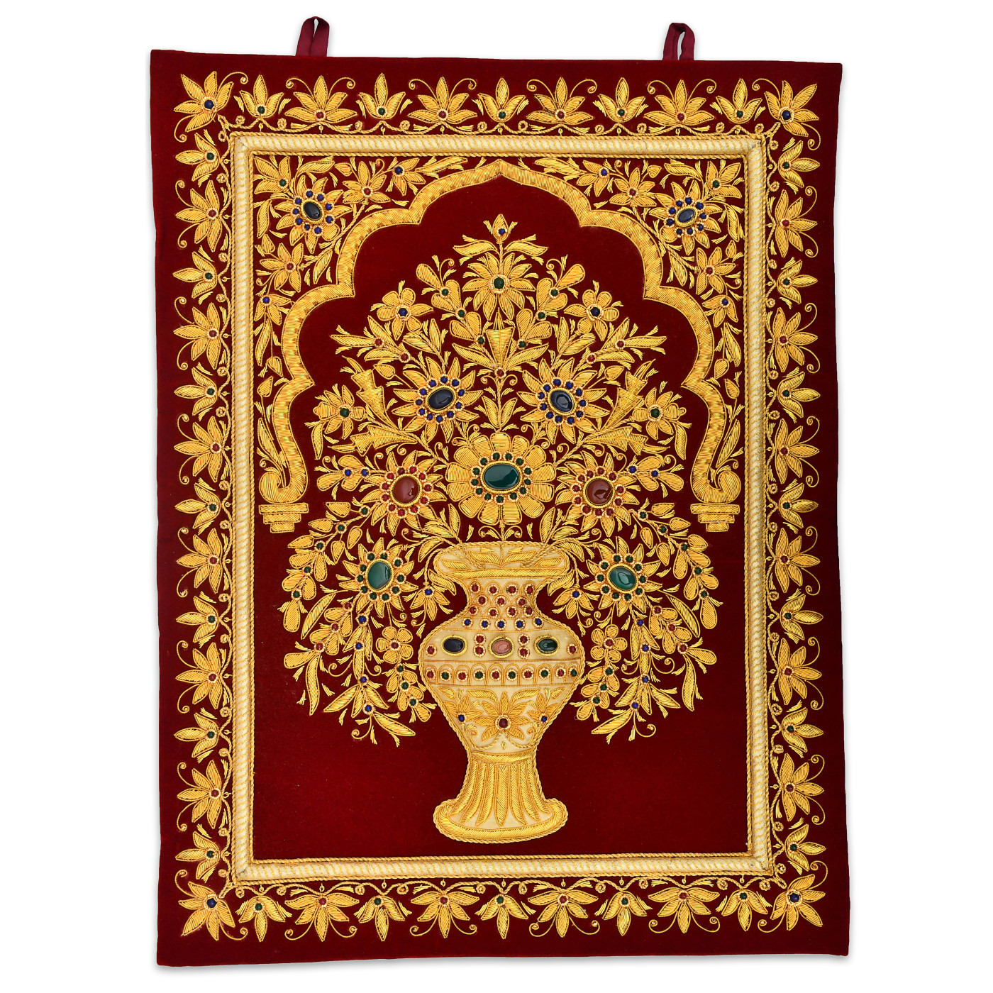 - An Absolutely Exquisite Wall Hanging studded with SEMI-PRECIOUS stones and intricate Zardozi Hand Embroidery in Gold metallic threads